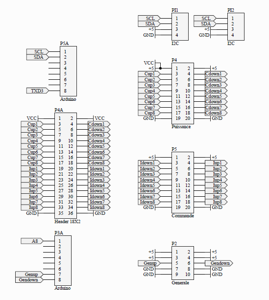 This PCB is directly plugged on Arduino and then I used flat wires to link to all boards.